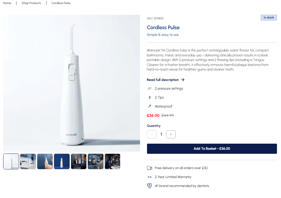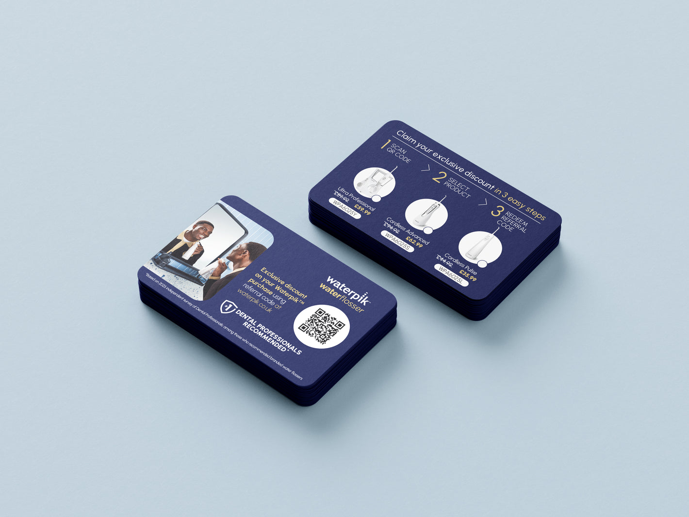 Les cabinets médicaux reçoivent un code de parrainage unique que les patients peuvent utiliser pour acheter directement sur le site Web de Waterpik, bénéficiant ainsi d'une réduction exclusive sur le prix total du produit – avec notre promesse qu'il s'agira de notre meilleur prix disponible au Royaume-Uni.